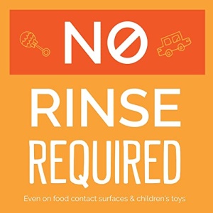 - Disinfectant with no rinse required, even on food contact surfaces and children’s toys