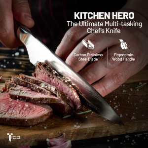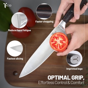 TICO Ultra Sharp 8 inch Chef’s Knife – German Carbon Steel Blade, Ergonomic Pakka Wood Handle – Professional Kitchen Knife for Chopping, Cutting, Thinly Slicing Meats & Vegetables