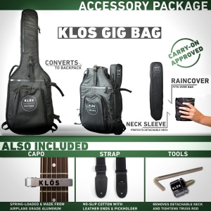 - FULL KIT: Buy on Amazon to receive a full kit including a custom made gig bag, high-end cotton and leather no-slip guitar strap, custom neck sleeve for guitar neck protection, a custom fitted gig bag rain cover, a KLOS branded screwdriver for easy guitar disassembly, a KLOS branded aluminum capo, and a hex wrench for adjusting the neck truss rod.