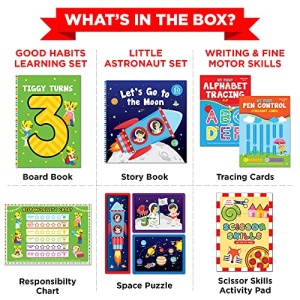 - AMAZING LEARNING SET FOR 3-YEAR-OLD BOYS & GIRLS:(1) PREMIUM BOOKS: 2 tear-resistant books that teach good habits, space & solar system, words & more. The book about good habits is a board book and the space book is laminated.(2) PUZZLES- High quality, 24 pc puzzle set develops logical thinking & builds curiosity about space and solar system(3) ART & CRAFT- 3-year-olds love scissors!So, we developed a fun 100% safe craft scissor set. It improves fine motor skills and is packed with hours of fun!