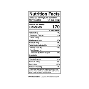 Details: Amaranth (Amaranthus cruentus) is one of the smallest grains. It was one of the staple grains of the ancient Incas and is known as “kiwicha” in the Andes today. It’s a “super grain” meaning it has all the amino acids your body needs. Amaranth also makes an amazing addition to loaves of bread, cakes, and cookies when popped. Besides protein, amaranth grain provides a good source of dietary fiber, and minerals such as iron, magnesium, phosphorus, copper and especially manganese. Shelf Life: 6 months if stored in *optimal conditions in the original packaging. *(70 degrees in a dry place.) learn more at www.organicgrains.com