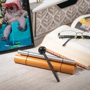 Tapped lightly with the rubber-tipped mallet, this single-tone chime emits a beautiful, gently pulsating ring that resonates an amazingly long time. The polished aluminum rod is fastened to a smooth, cherry-finished hardwood base that measures 7-1/4 inches in length, small enough to keep on a desk or by the bed. One simple ring of this chime helps stress disappear. Musician Gary Kvistad founded Woodstock Chimes in 1979, and today the family-owned company produces a wide range of handcrafted, precision-tuned chimes. A one-year warranty covers the chime against defects, and all tuned Woodstock Chimes come with a lifetime tuning guarantee. –Ann Bieri